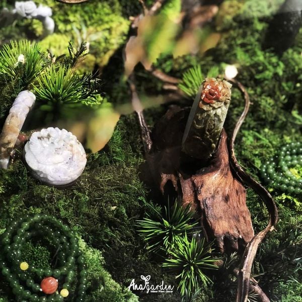 Tạo điểm nhấn trang trí bằng cách kết hợp giữa rêu ngủ đông cùng đá phong thủy – sự kết hợp giữa các yếu tố mang năng lượng tích cực đem lại nhiều lợi ích cho tinh thần và sức khỏe của bạn, giúp cân bằng không gian, tăng sự gần gũi với thiên nhiên, giảm căng thẳng, gia tăng sự tập trung.