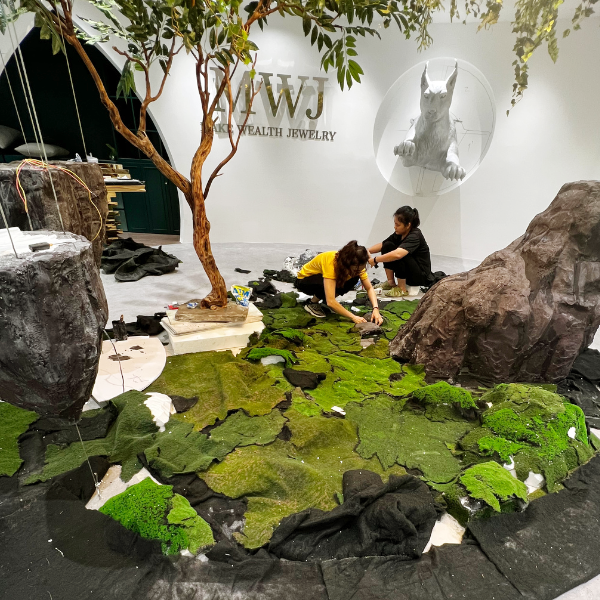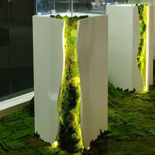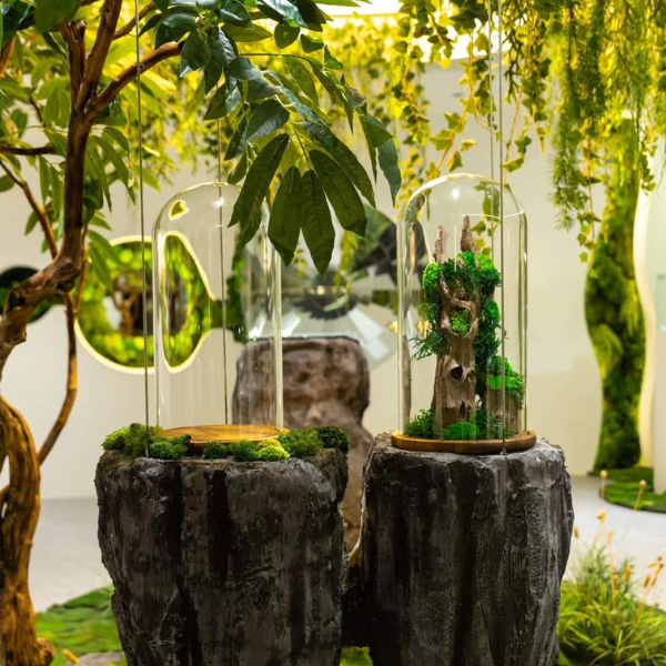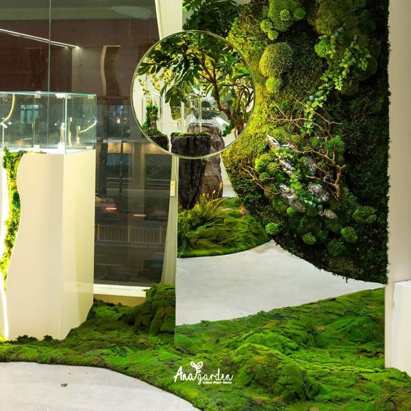 Trong diện tích rộng 40 m2 là sự kết hợp tinh tế và hoàn hảo giữa Rêu Vĩnh Cửu và Cây Plastic dùng cho nội thất, được thể hiện qua nhiều hạng mục gồm hệ thống tường rêu, gương rêu nghệ thuật, ốc đảo xanh, sàn phủ thảm rêu và các chụp thủy tinh trưng bày trang sức.