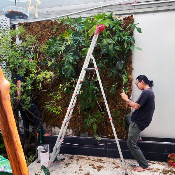 Dự án bao gồm hai tường cây với diện tích tổng cộng gần 50m2. Mỗi tường mang một phong cách thiết kế riêng biệt, tạo ra thẩm mỹ và cảm xúc khác nhau.