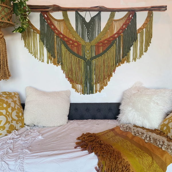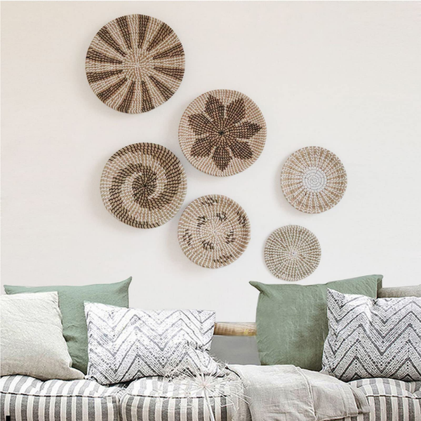 Các vật liệu thiên nhiên như mây, tre, nứa, kết hợp với nghệ thuật macrame sẽ mang lại sự mộc mạc, gần gũi mà không kém phần tinh tế. Bạn có thể sử dụng các đĩa tròn đan lát hoặc tấm trang trí macrame để tạo thành các tác phẩm độc đáo trên tường. Các sản phẩm này không chỉ tạo điểm nhấn trang trí mà còn làm cho không gian trở nên ấm cúng và gần gũi. Chúng cũng tăng thêm kết cấu cho bức tường mà không quá phô trương, có thể hấp dẫn khi lấp đầy các góc nhỏ, như nửa bức tường bên cạnh khung cửa, hoặc những góc rộng hơn, như nửa trên của bức tường phía trên giường.