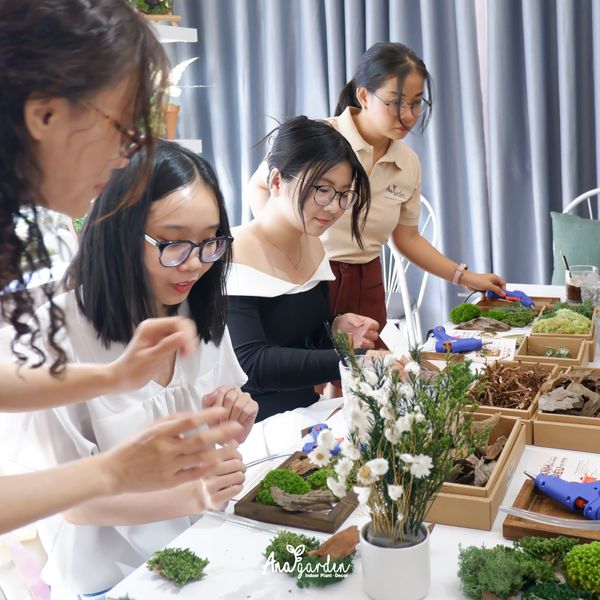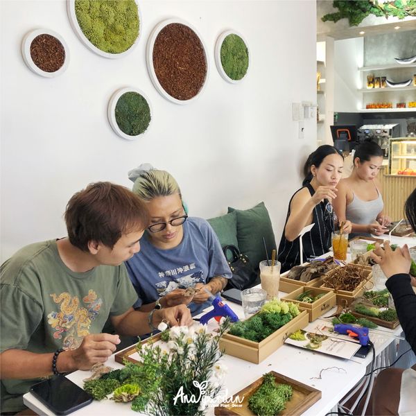 Các bạn khách dễ thương đã được ANA hướng dẫn chi tiết để tự tay tạo nên các tác phẩm Rêu bảo tồn độc đáo - không cần chăm sóc - chỉ mang về nhà - độ bền 10 năm trong một trong gian showroom xanh mát, tinh tế và đầy nghệ thuật!